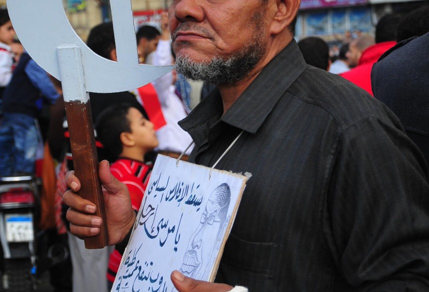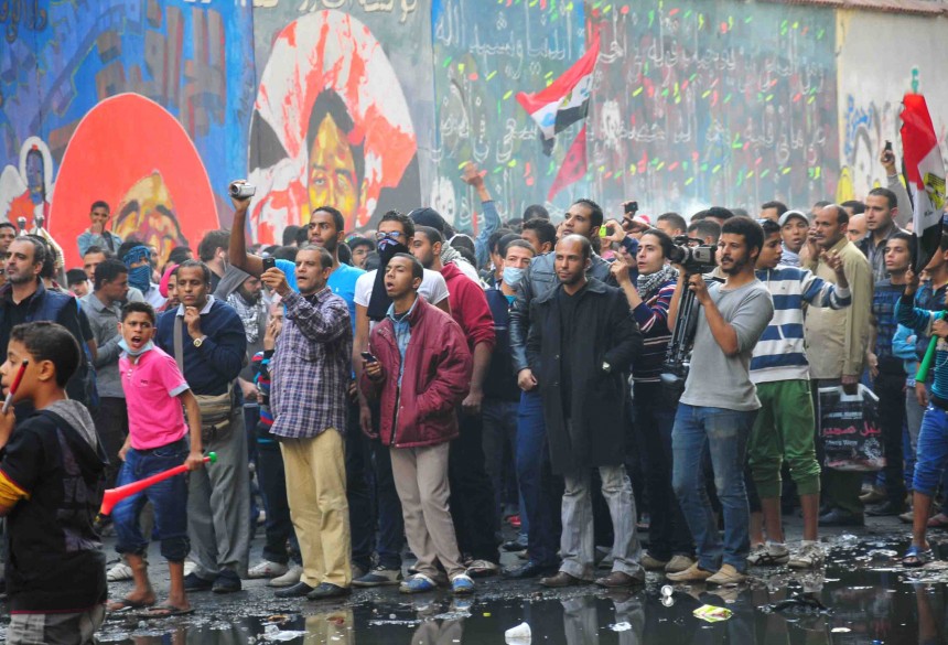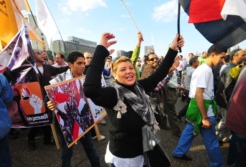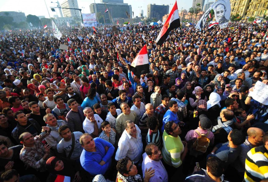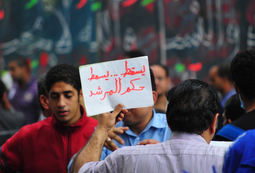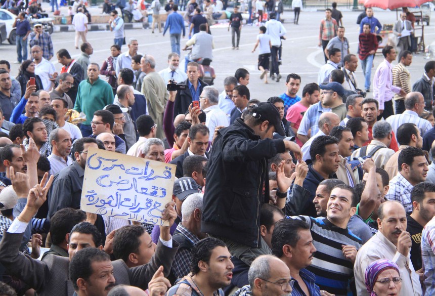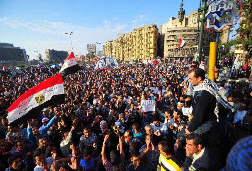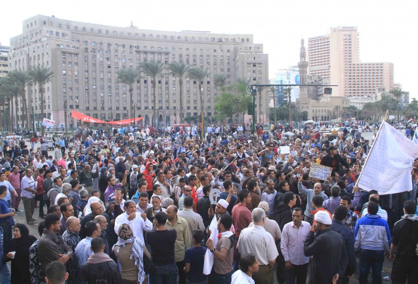 Protesters gather in Tahrir Square to show their rejection of President Morsy’s latest constitutional decree and calling for the fall of the regime, as Mohamed Mahmoud clashes continue for the fifth day. Thousands of protesters are currently marching to Tahrir.