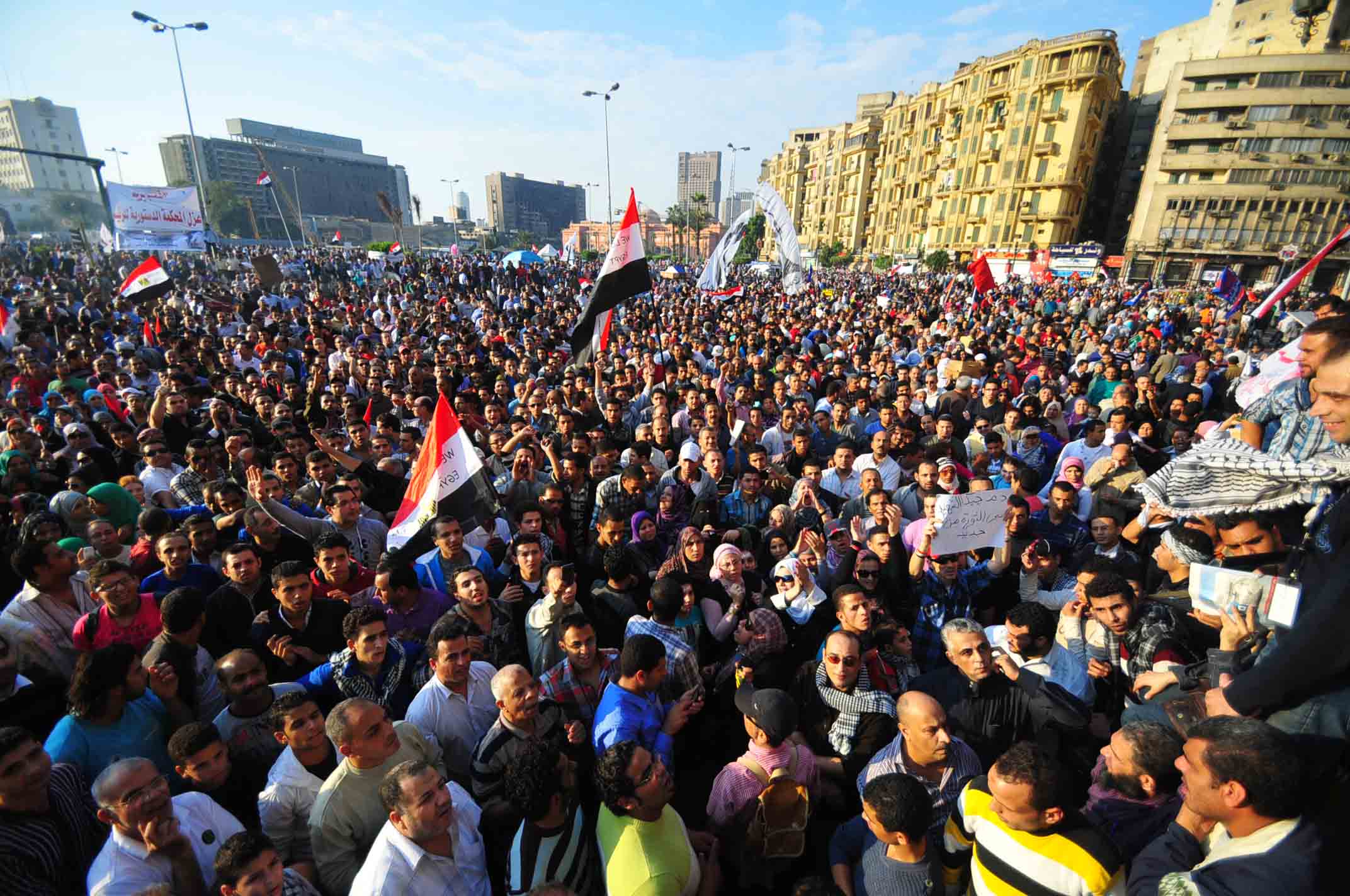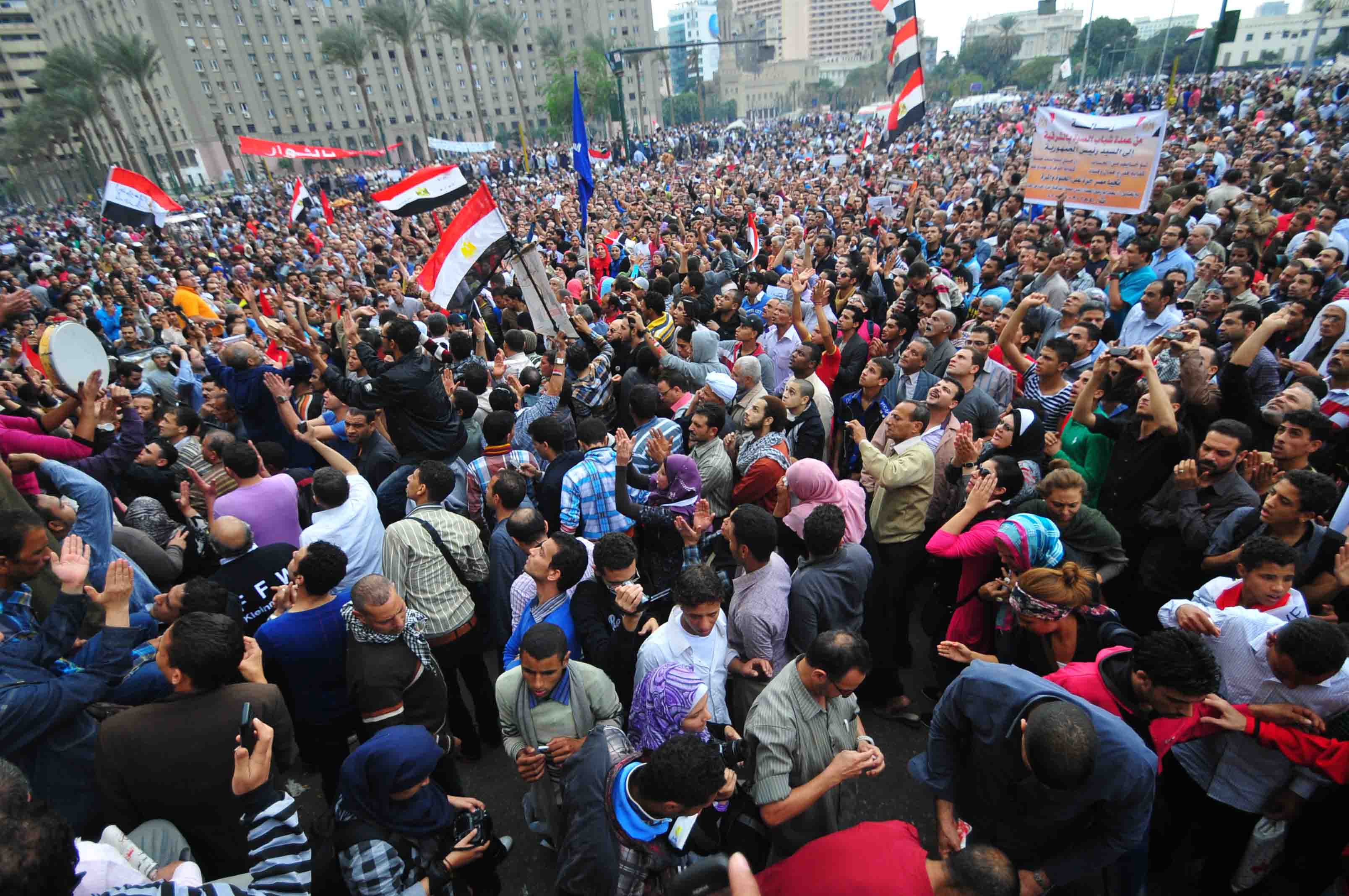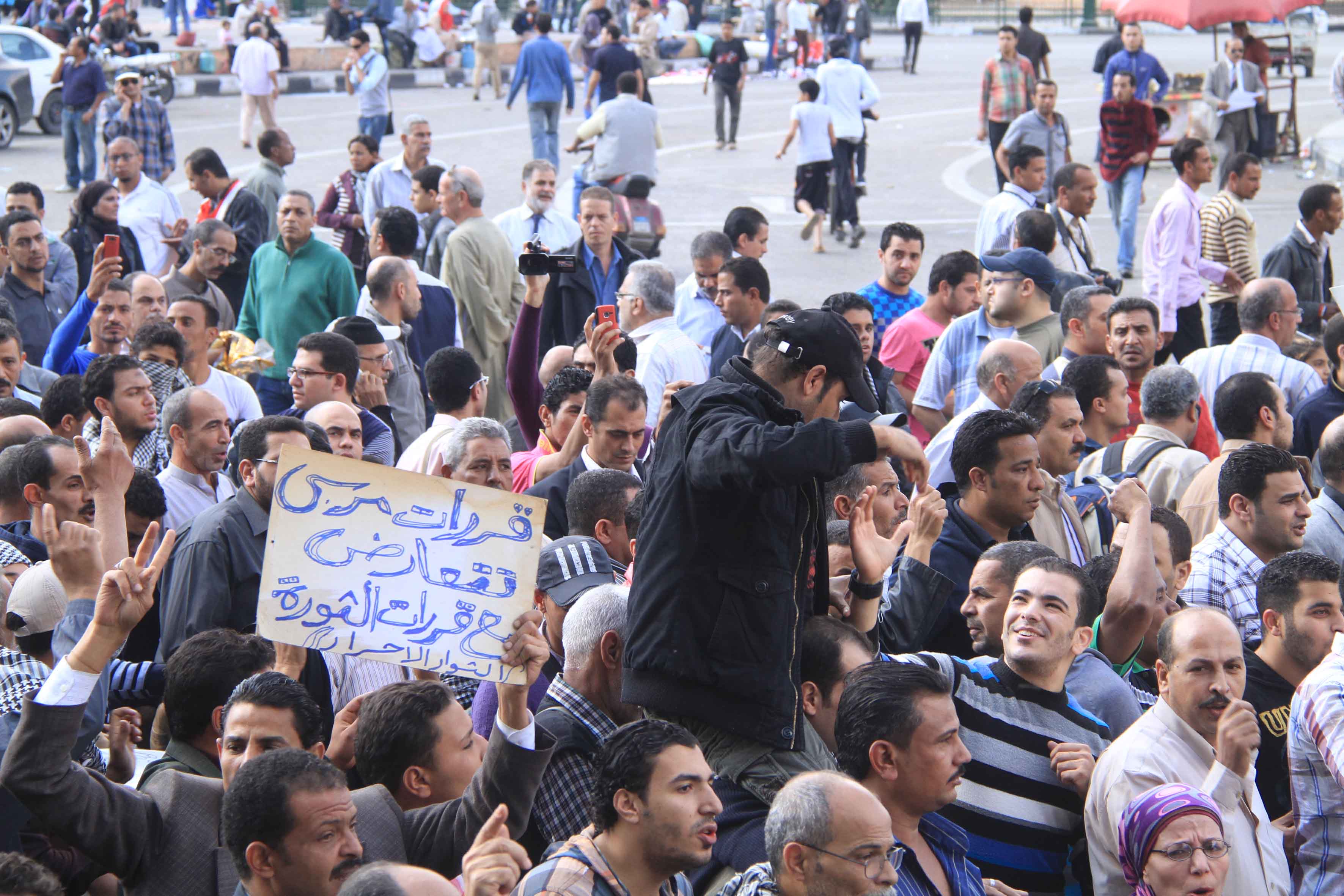Protesters gather in Tahrir Square to show their rejection of President Morsy’s latest constitutional decree and calling for the fall of the regime, as Mohamed Mahmoud clashes continue for the fifth day. Thousands of protesters are currently marching to Tahrir.