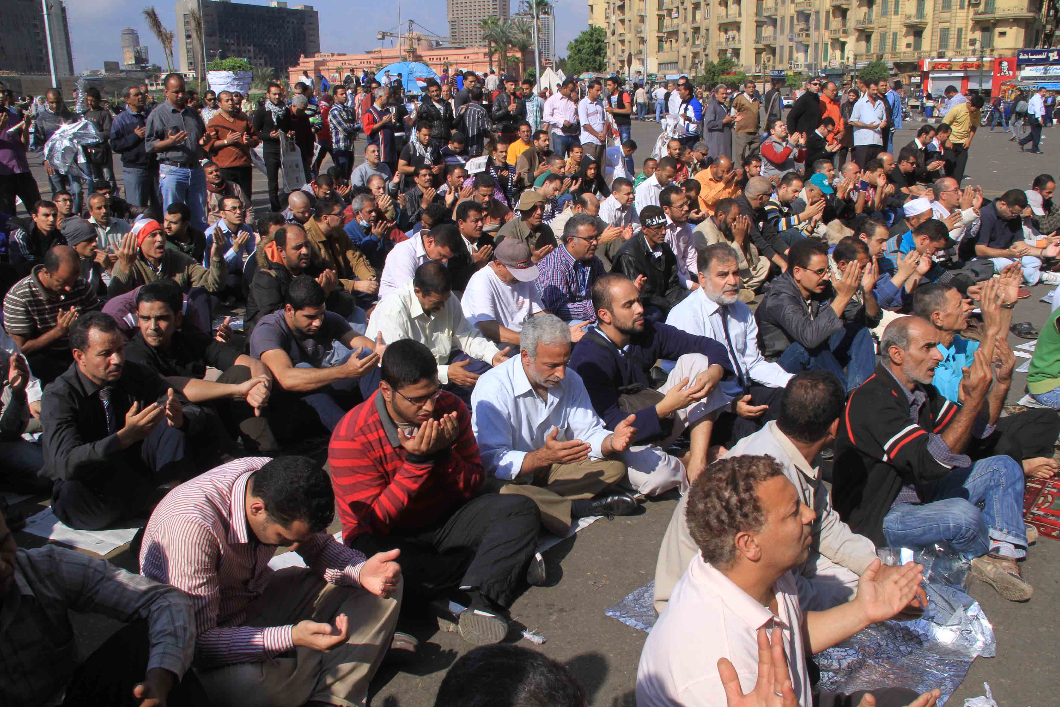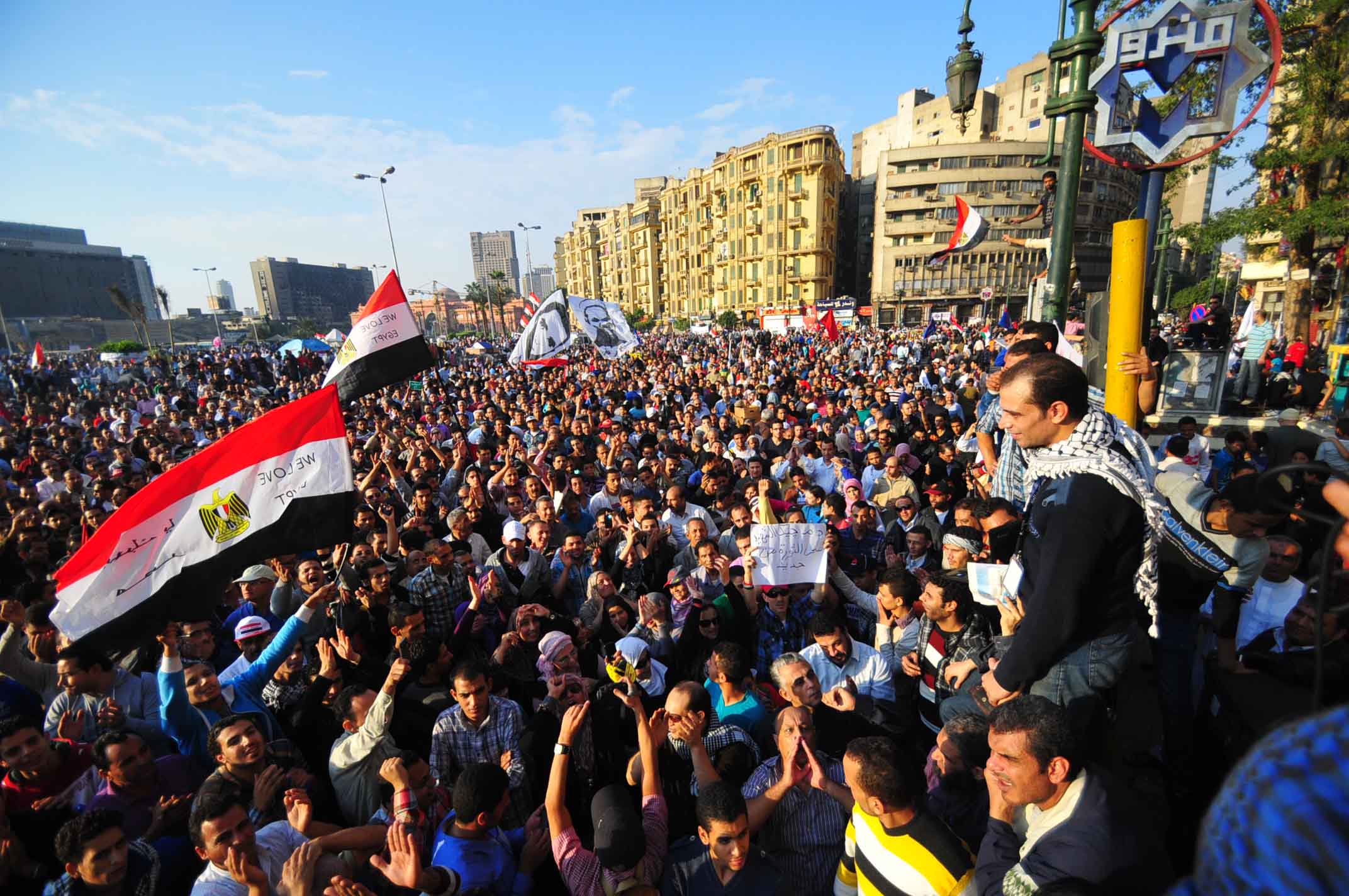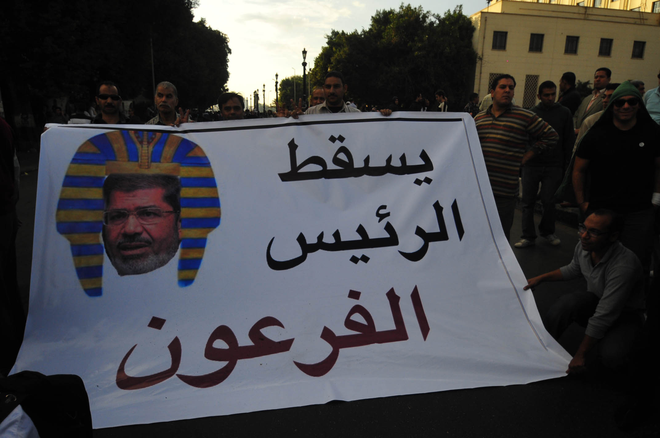 Protesters gather in Tahrir Square to show their rejection of President Morsy’s latest constitutional decree and calling for the fall of the regime, as Mohamed Mahmoud clashes continue for the fifth day. Thousands of protesters are currently marching to Tahrir.