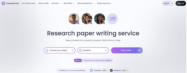 Top research paper writing services reviews mention that EssayService connects students with a pool of over 350+ academic experts who specialize in various subjects. Every writer works from scratch, ensuring highly original, AI-free content.